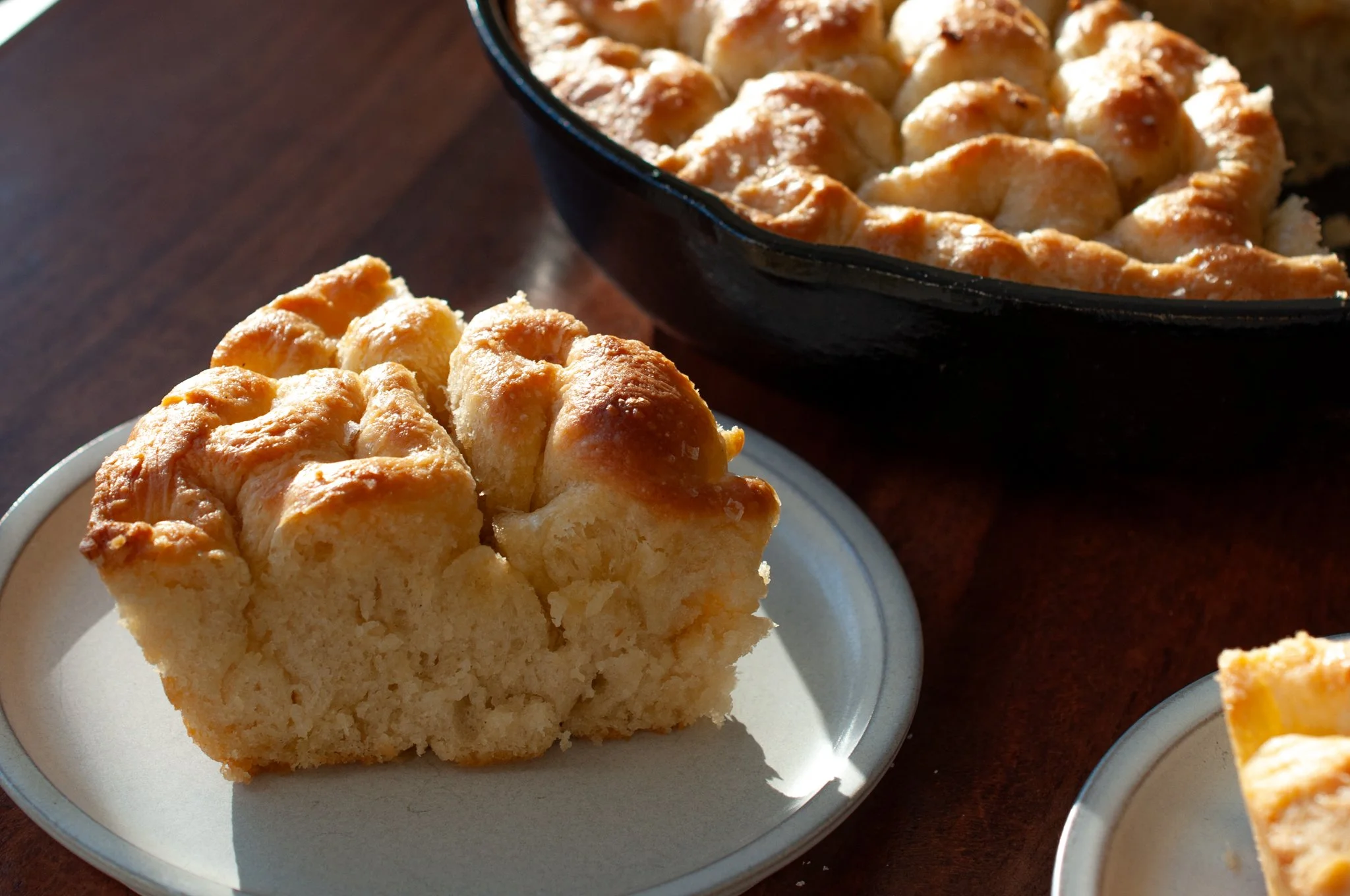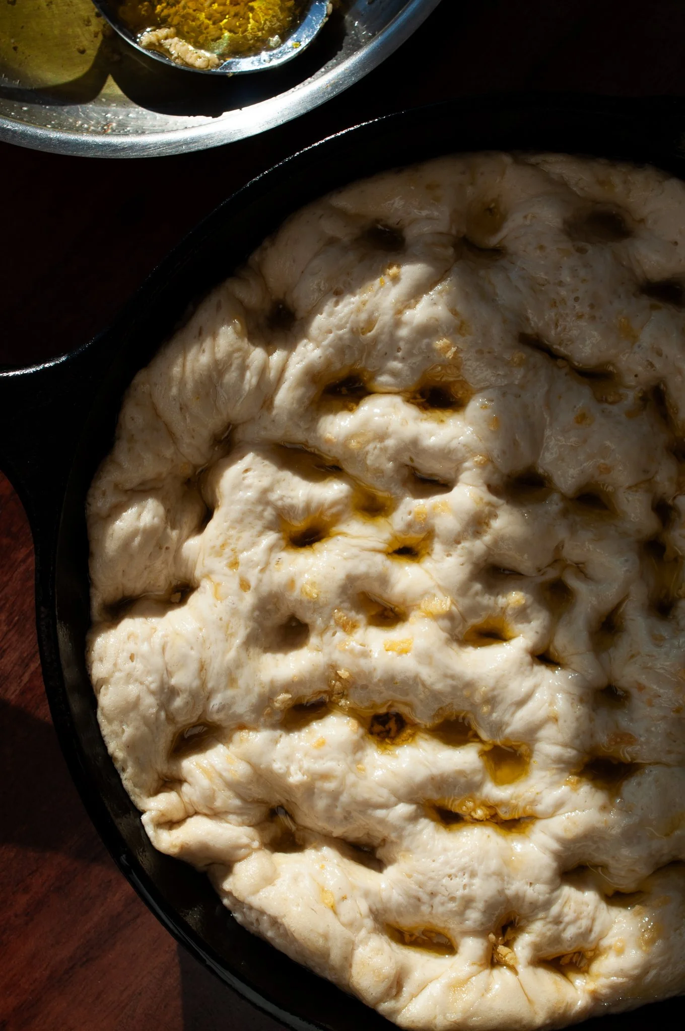 Shape & second rise: Transfer dough to skillet, turning to coat in oil. Gently press outward (don’t force it to the edges yet). Cover and rest 45–60 minutes until very puffy.