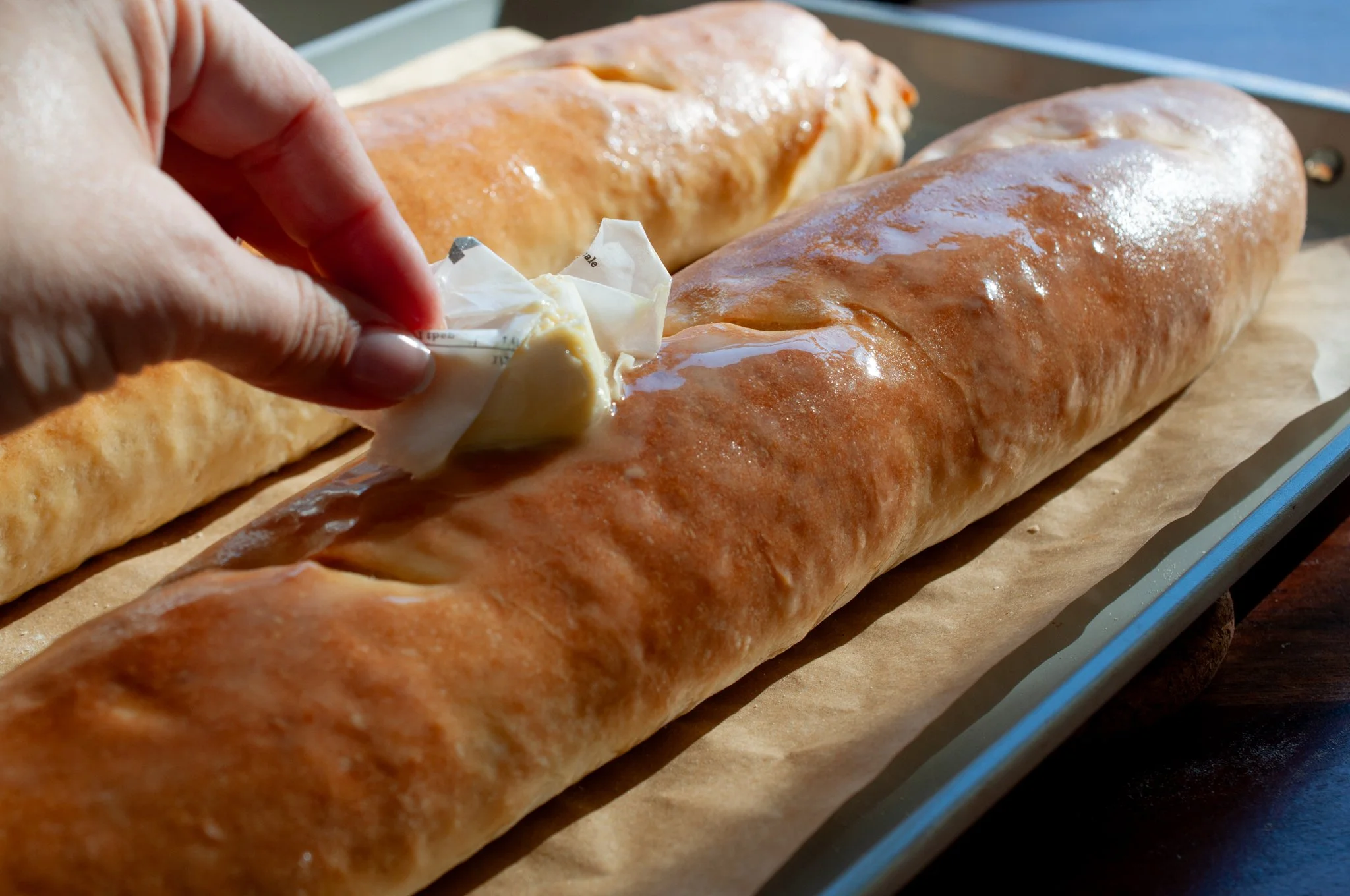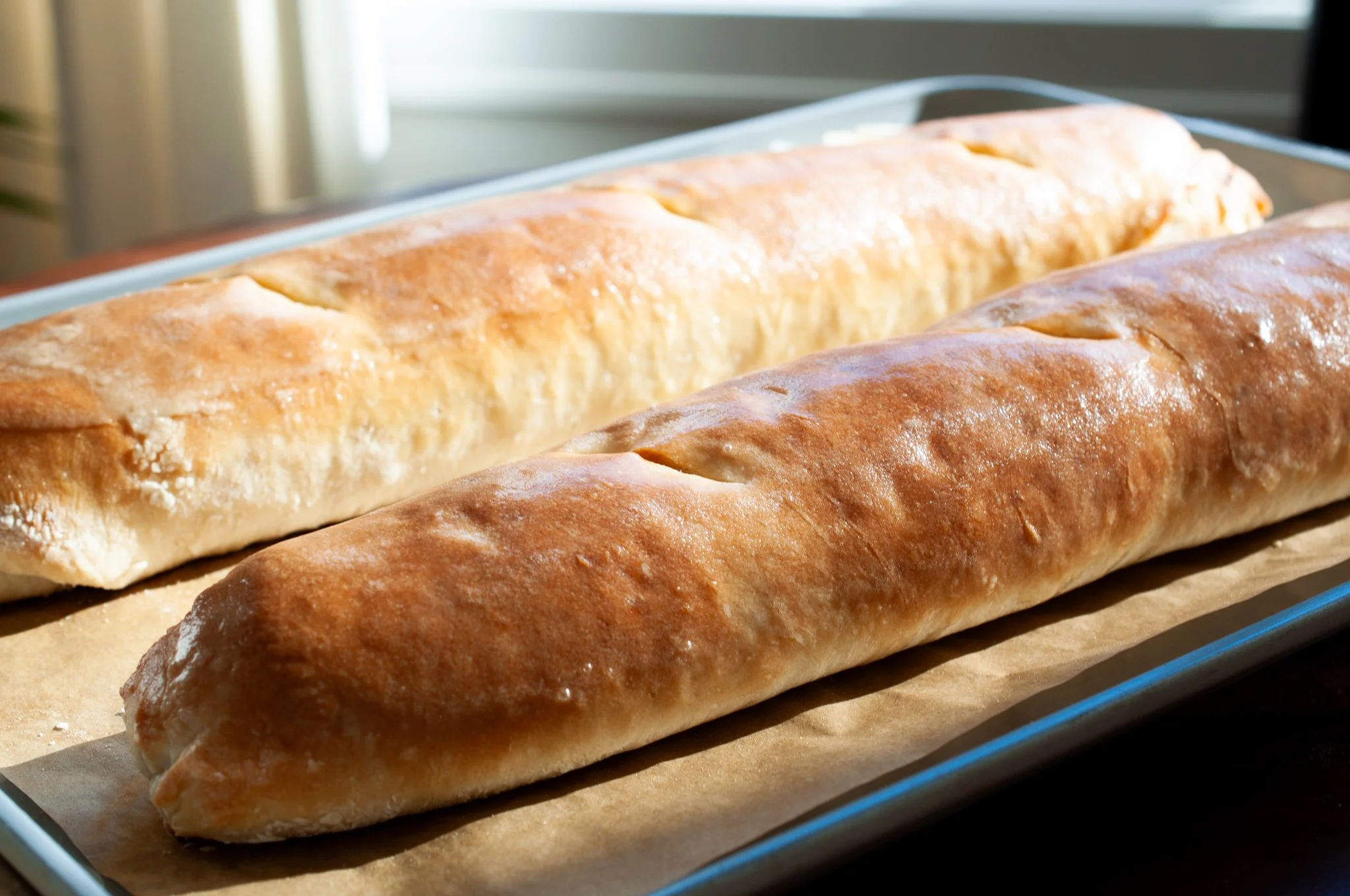 Tuck both ends under and pinch the seams closed. Gently round the edges, then place on a parchment-lined baking sheet. Repeat with the remaining dough, and make then roughly the same length and width. Cover lightly with a towel and let rise for 30–60 minutes (longer if time allows).