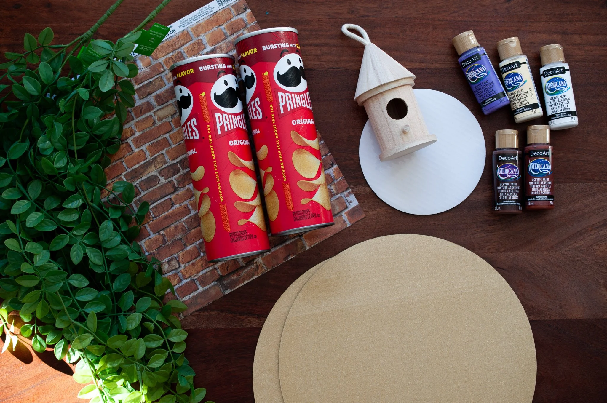 Gather all of the items, plus two Pringles cans. Empty/eat the chips and wipe out the cans. I filled one with clementines so the base was sturdy. (I wanted rocks but it was snowing so I chose not to go outside.) Don’t glue that lid shut if you use perishable items for weight.