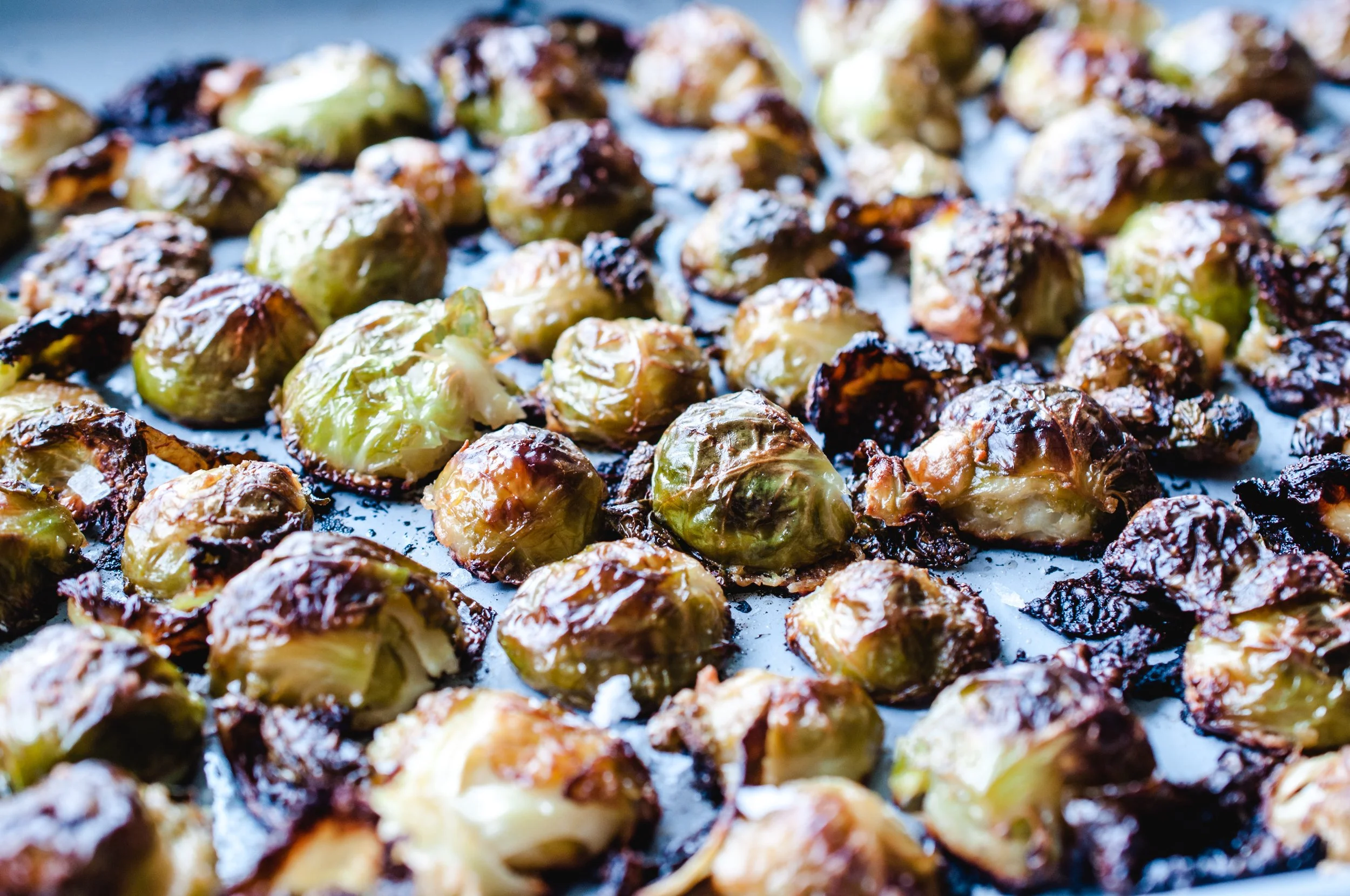 Dump them into a mixing bowl and toss with the roasted garlic, a drizzle of olive oil, and salt. If you don't have time to roast garlic clove heads, you can use 2 Tablespoons of freshly minced garlic. However, use a garlic press to mince as fine as possible and mix with olive oil prior to coating the brussel sprouts to reduce the chance of the garlic burning.